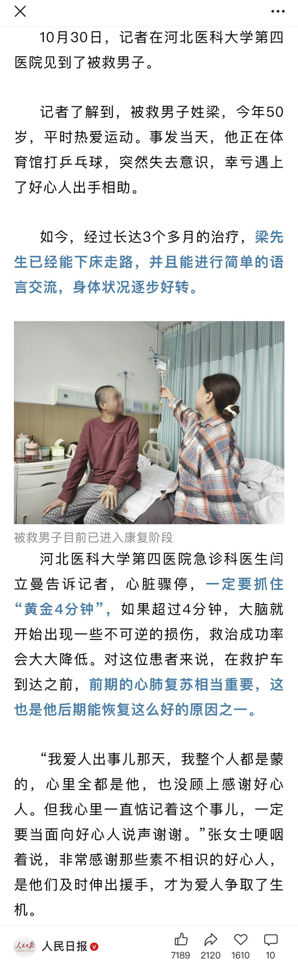 看着患者重获新生,东院急诊科医务人员表示,所有的日夜坚守、艰辛付出,都化作了满心的欣慰与感动。此次生命救援,也被人民日报官方微信号关注报道,生动诠释了我院“以患者为中心”的医者担当与精湛的救治水平。