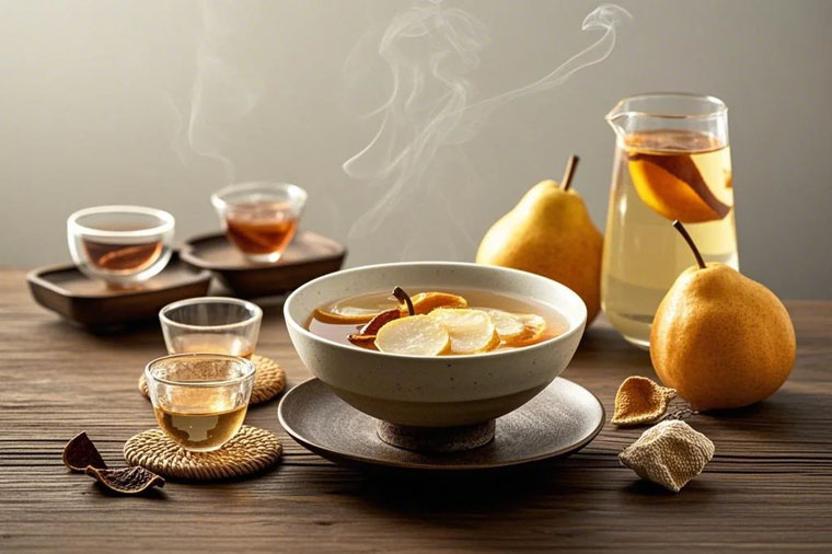 荠藕甘露饮:荸荠20枚,百合50克,梨子1个,银耳两朵。将荸荠洗净去皮,百合、梨一起捣烂取汁与银耳一起炖煮。